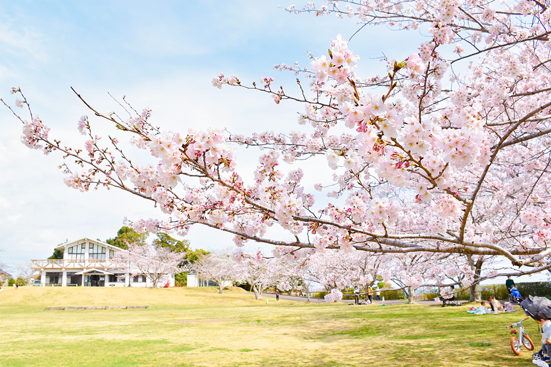 公園内には体育館やテニスコート、桜が咲く芝生広場などの施設があるほか、公園から坂道を10分位歩くと魚見塚展望台もあり、天気の良い日には美しい海岸線の景色が広がります。