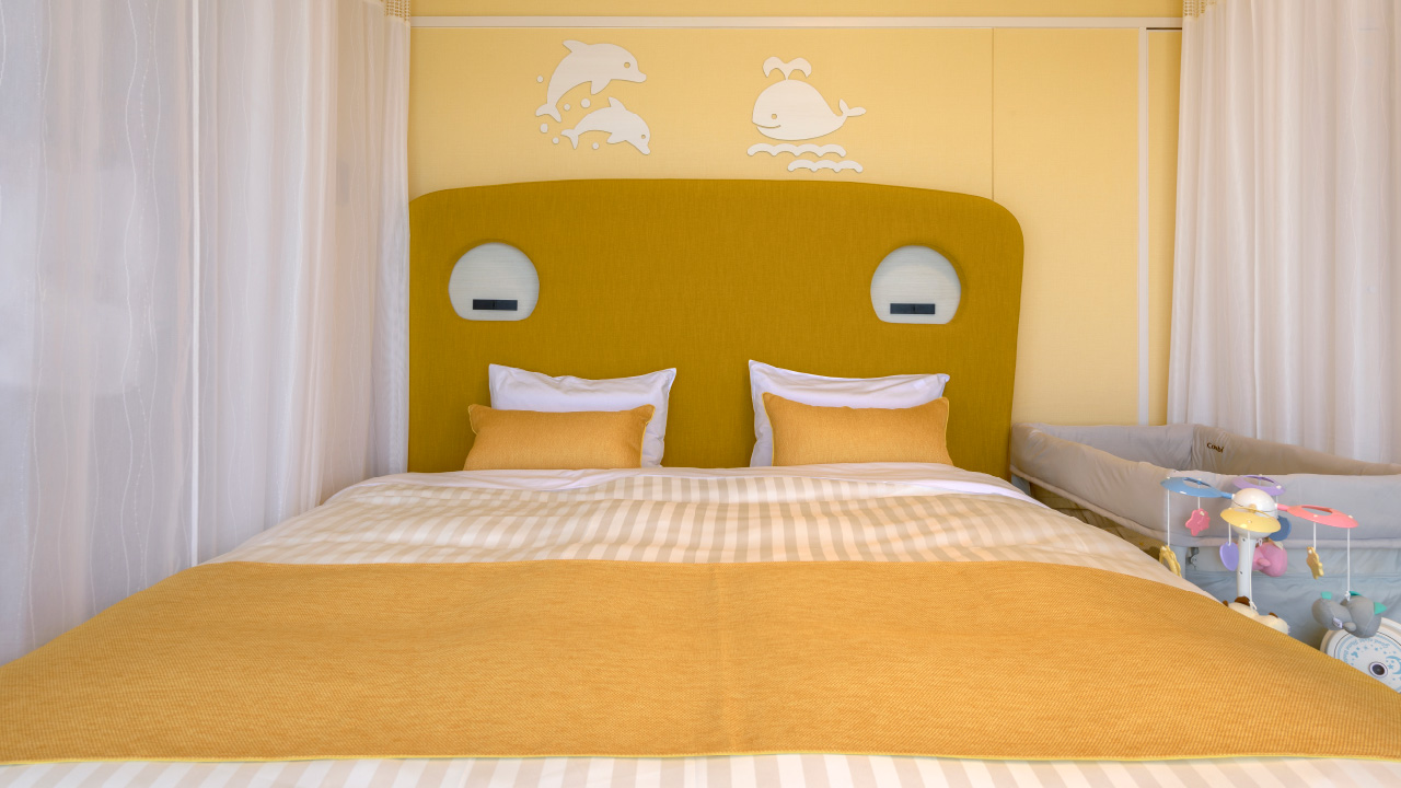 広々キングサイズベッドに加え、安心のベビーベッド。