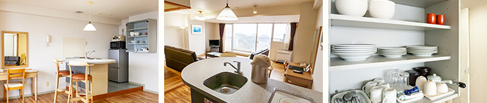 キッチン(一口電気コンロ)・冷蔵庫・電子レンジ・電気ポット・お茶セット・まな板・包丁・片手鍋・フライパン・菜箸・おたま・フライ返し・缶切付き栓抜・ワインオープナー・平皿・スープ皿・マグカップ・ナイフ・フォーク・スプーン・コップ・箸・ザル・ボウル・食器用洗剤・食器洗い用スポンジ